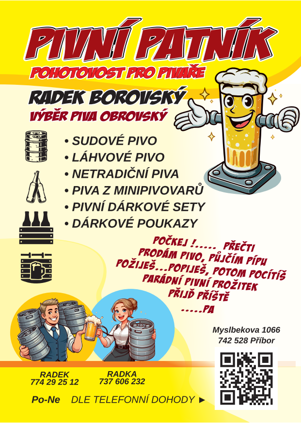 Vítejte v Pivním patníku, kde se specializujeme na prodej lahodného sudového a láhvového piva v Příboře. Naší snahou je nabízet co nejširší výběr druhů piv, jak od průmyslových pivovarů, tak od malých soukromých. Naše skladovací prostory, ale bohužel, nejsou neomezené, proto preferujeme zásoby hlavně v 15L soudcích jedenácti a dvanácti stupňového piva. Další varianty, které už spousta našich zákazníků zná, řešíme po telefonu, objednávkovým systémem, kdy některé druhy se dají sehnat do týdne ,některé dle závozu pivovarů. V současné době máme během sezóny skladem kolem 30 druhů piv.